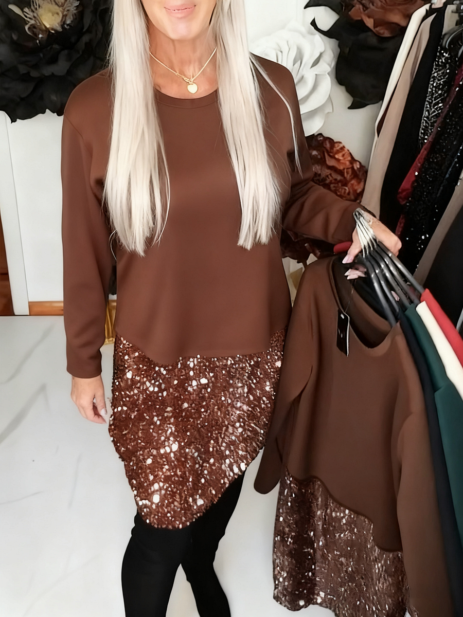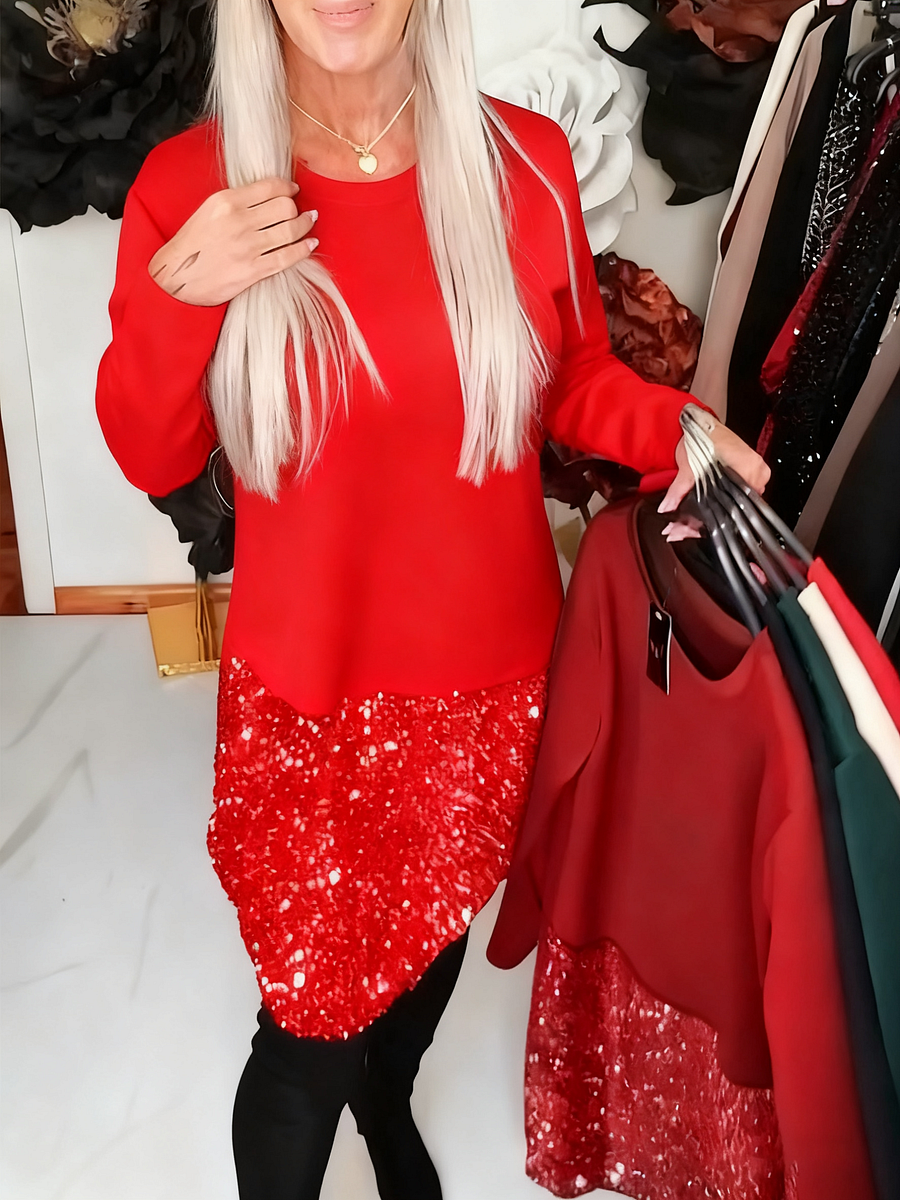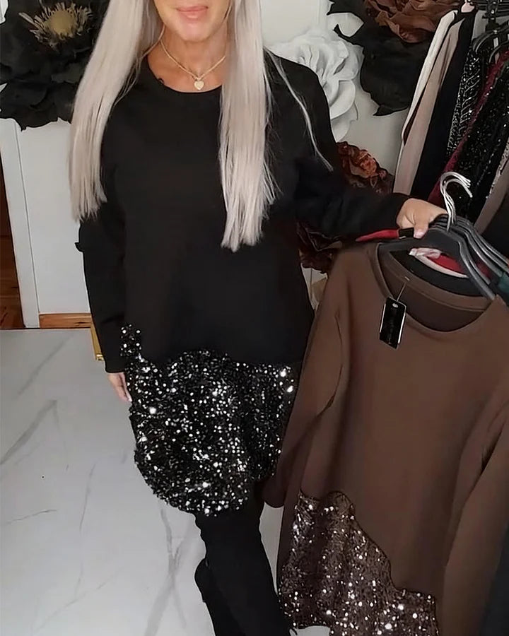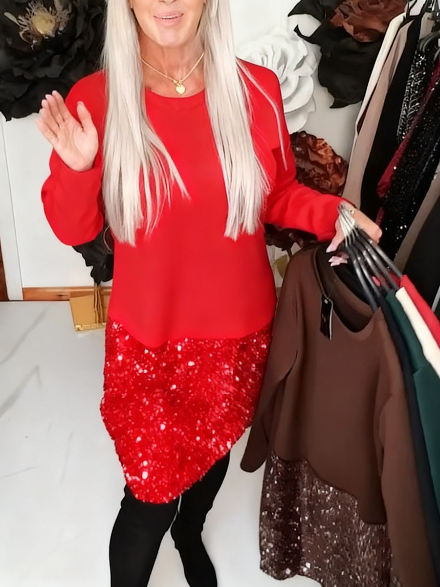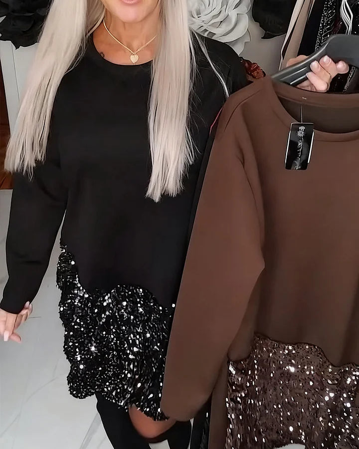✅Confidence in Every Step: The long sleeves and round neck keep the upper part refined and easy to wear, while the glittering patchwork brings the celebration. This contrast makes the dress feel bold yet grounded. It’s made for people who want comfort, presence, and a bit of shine in one piece.